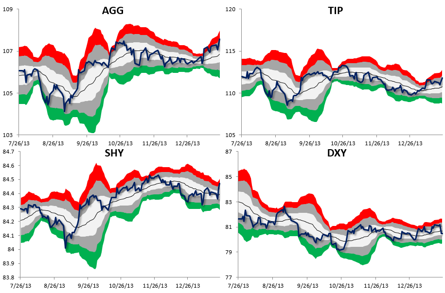 Equities fell sharply for the week led by International Emerging Markets (EEM) which was down 3.90% for the week. Bond prices were mixed. Long Term Treasuries (TLT) were up 1.90%. The 10 Year Treasury is at 2.72% after beginning the year above 3%. The charts below show the normal trading ranges for various indices for the last six months. The red (or green) area indicates 2-3 standard deviations above (or below) the normal 21 day trading range. The gray area indicates 1-2 standard deviations above (or below) the normal 21 day trading range.