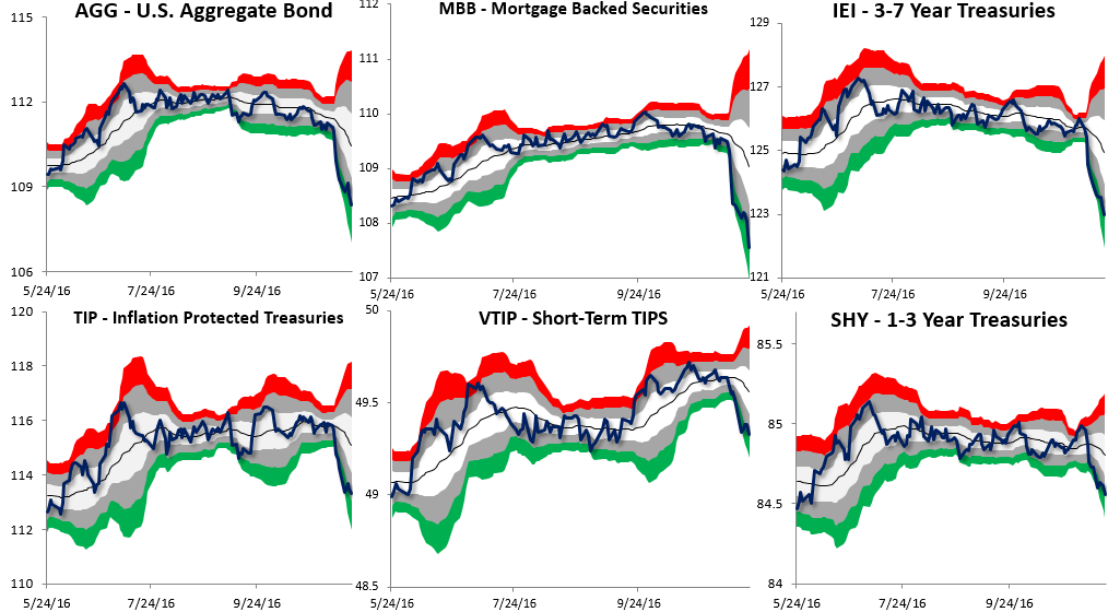 Stock prices were mixed for the week while Bond prices were up. The Fed Funds futures are implying a 71.6% chance of another rate hike by June 2017 down from a 75.3% chance last week according CME Group's FedWatch tool. The charts below show the normal trading ranges for various indices for the last six months. The red (or green) area indicates 2-3 standard deviations above (or below) the normal 21 day trading range. The gray area indicates 1-2 standard deviations above (or below) the normal 21 day trading range.