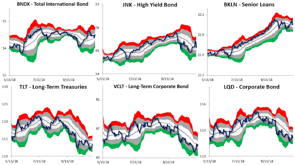 The S&P 500 (SPY) ended up 2.93% for the week after starting the week down with the biggest Christmas Eve decline ever. The Fed Funds futures are now implying a 88.3% chance that the Fed won't hike rates during 2019 (up from 57.0% last week) according to CME Group's FedWatch tool. The charts below show the normal trading ranges for various indices for the last six months. The red (or green) area indicates 2-3 standard deviations above (or below) the normal 21 day trading range. The gray area indicates 1-2 standard deviations above (or below) the normal 21 day trading range.